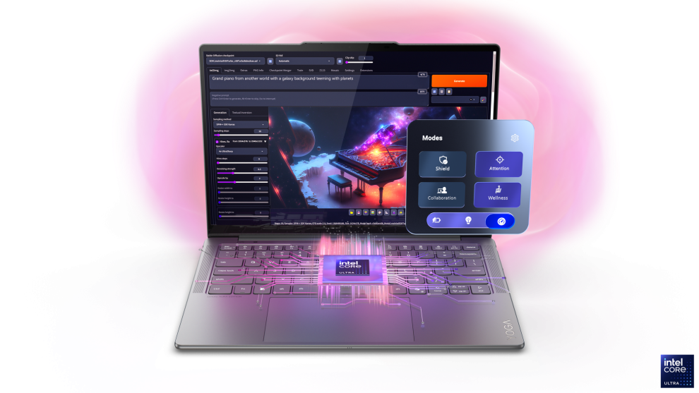Además de la inteligencia artificial, el Yoga Slim 7i Aura Edition incluye una serie de modos funcionales que optimizan tu jornada de forma automática. Por ejemplo, el Modo Atención bloquea notificaciones y sitios que te distraen, el Modo Colaboración mejora tu imagen y audio en videollamadas sin que tengas que ajustarlo manualmente, el Modo Privacidad detecta si alguien más está mirando tu pantalla y la difumina para proteger tu información, y el Modo Power administra la energía según tu uso diario para que puedas llegar al final del día sin preocuparte por el cargador.